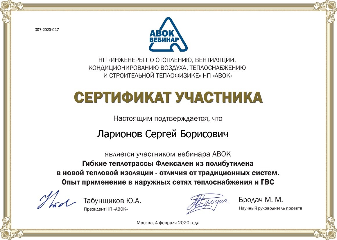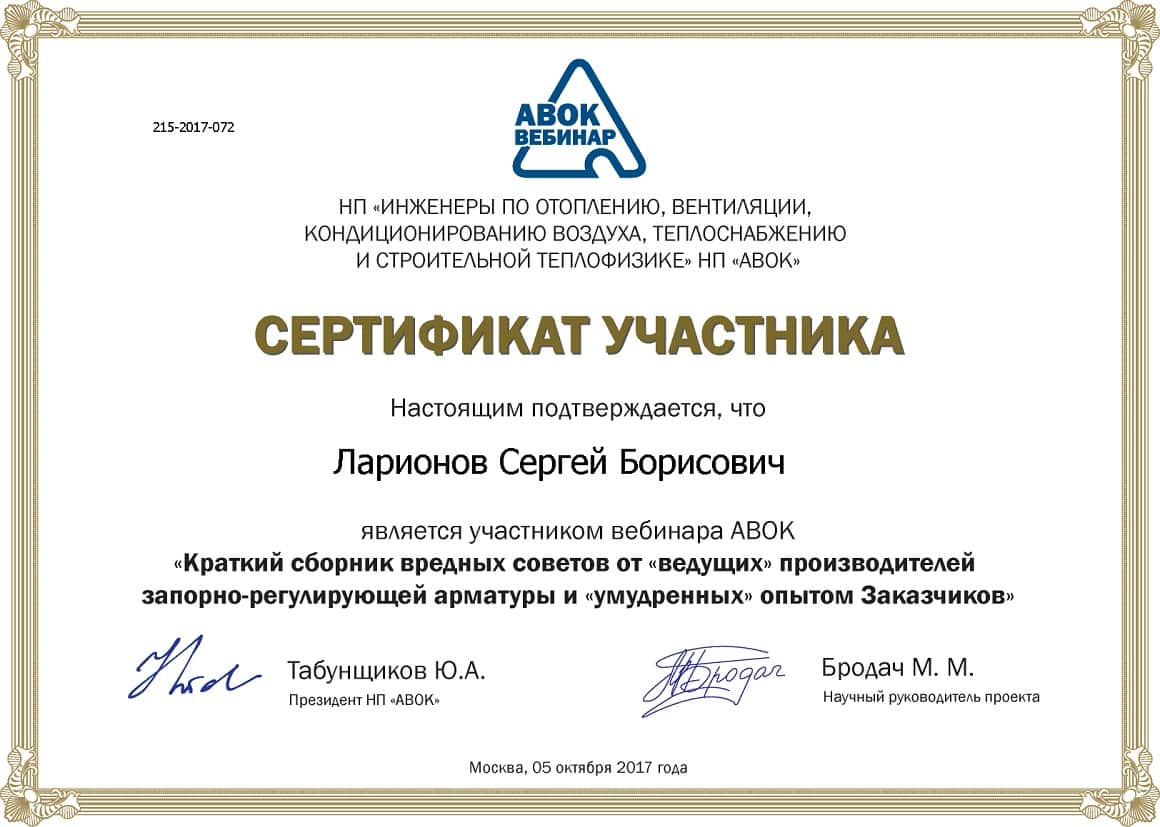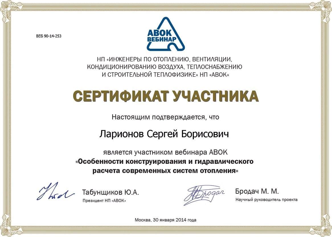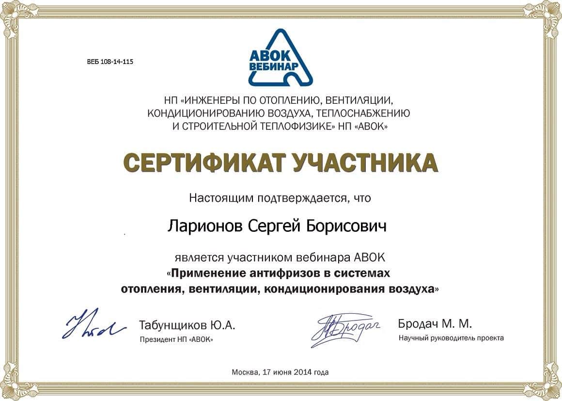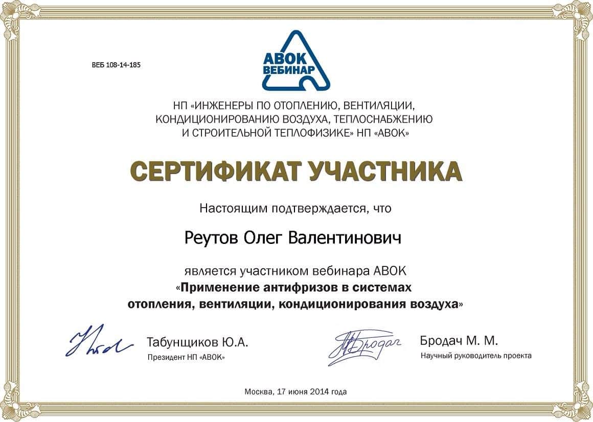 Сертификат обучения по применению антифризов в системах отопления и вентиляции