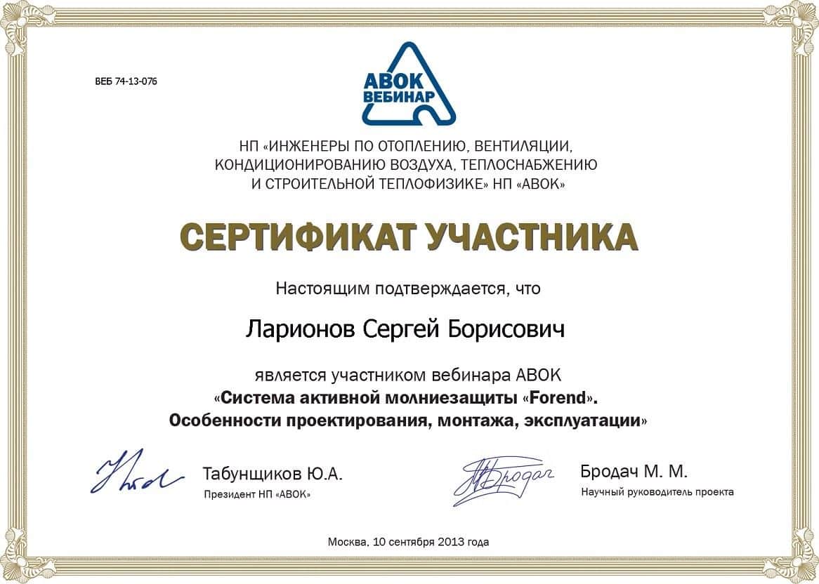 Сертификат обучения по активной молниезащите Forend, проектирование, монтаж