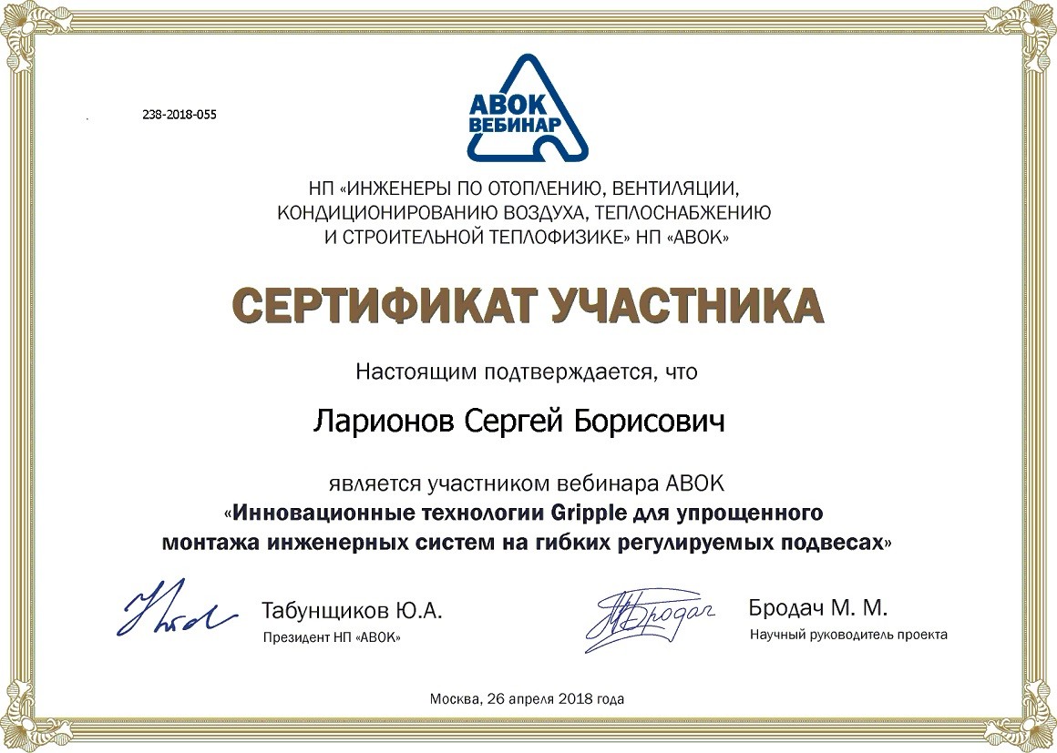 Сертификат обучения по конвекторам Varmann, встраиваемым в пол