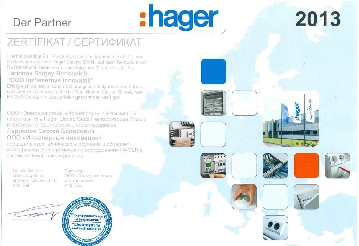 Сертификат обучения по электротехническому оборудованию Hager для систем электроснабжения