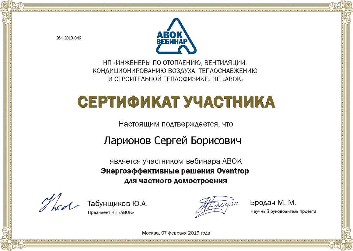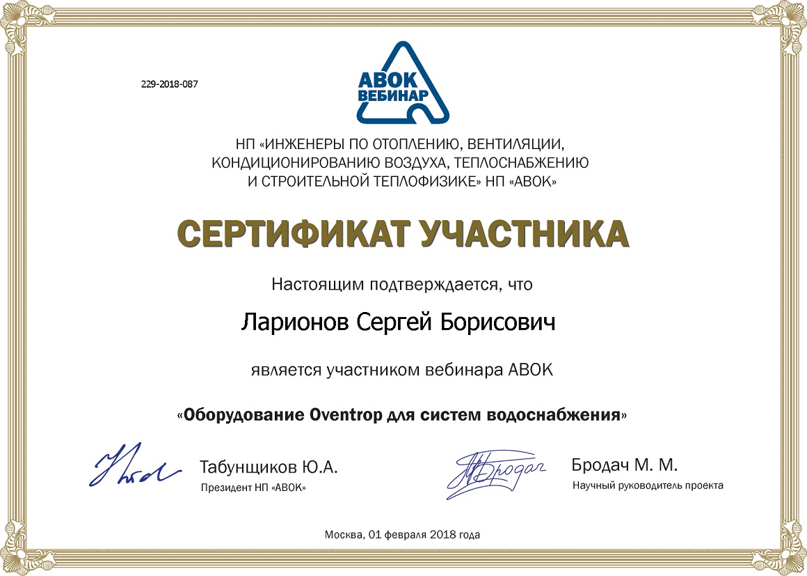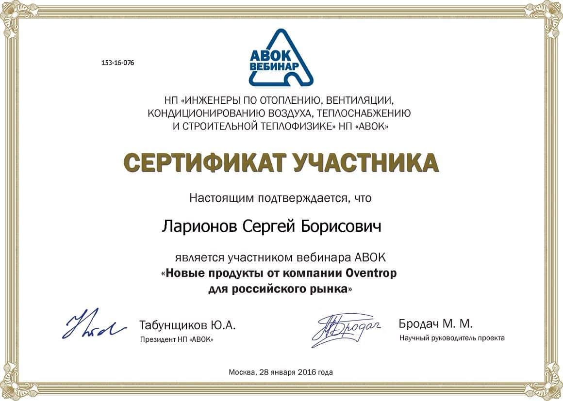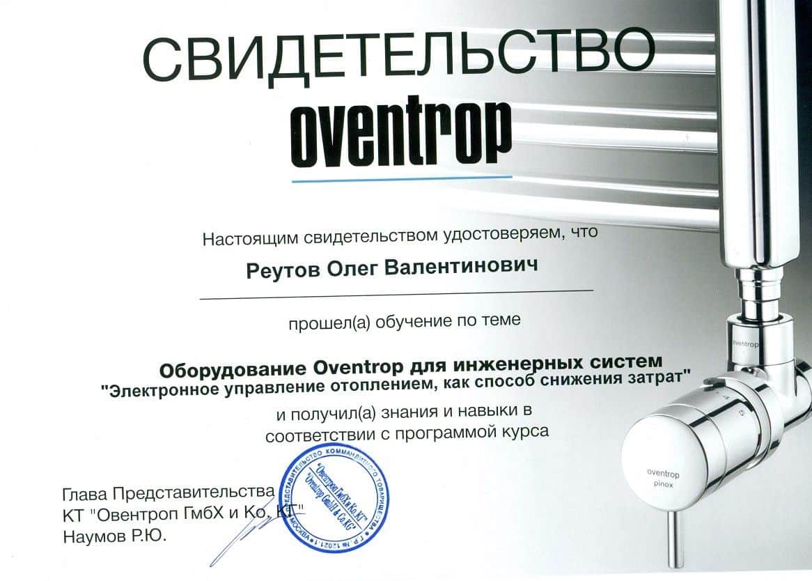 Сертификат обучения по технике Oventrop для систем отопления зданий