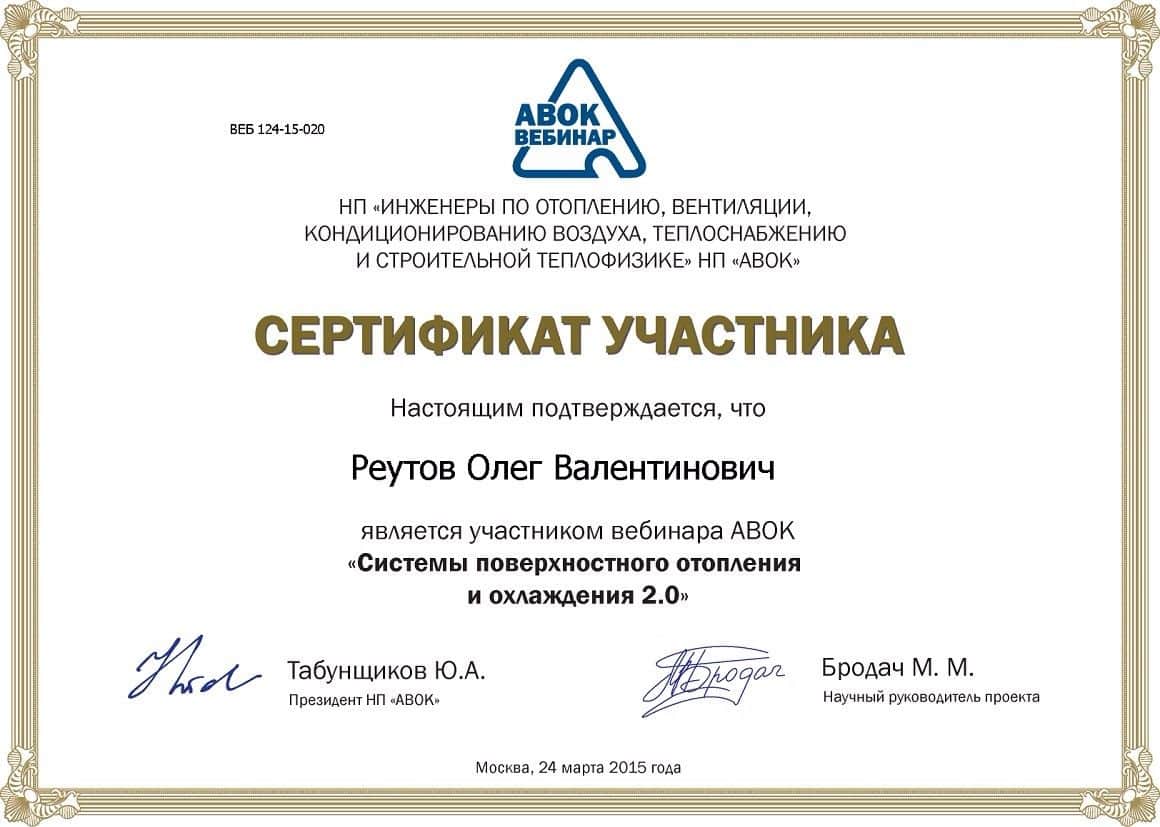 Сертификат обучения по системам поверхностного отопления и охлаждения Uponor