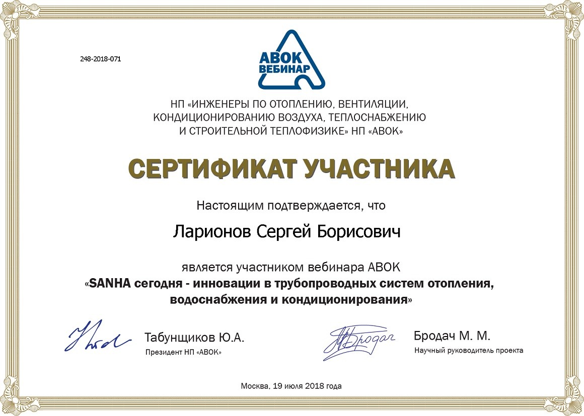 Сертификат обучения по оборудованию SANHA для систем отопления