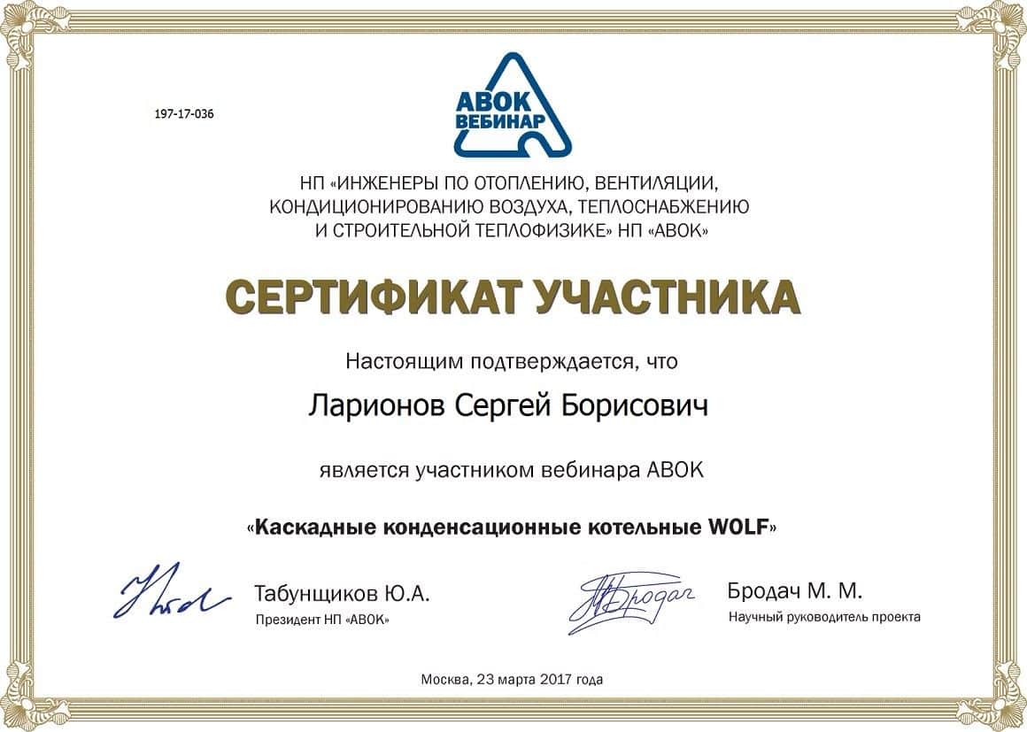Свидетельство обучения по каскадным конденсационным котельным Wolf