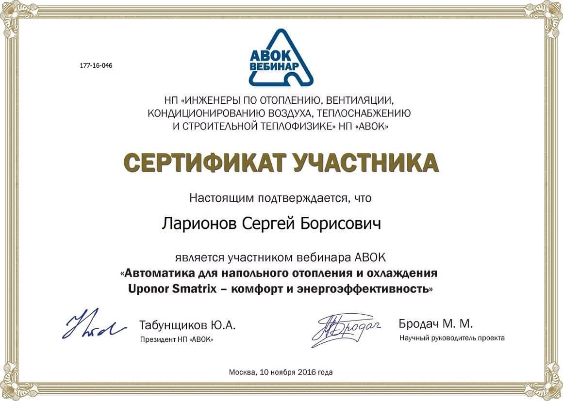 Сертификат обучения по автоматике  Uponor Smatrix для водяного теплого пола