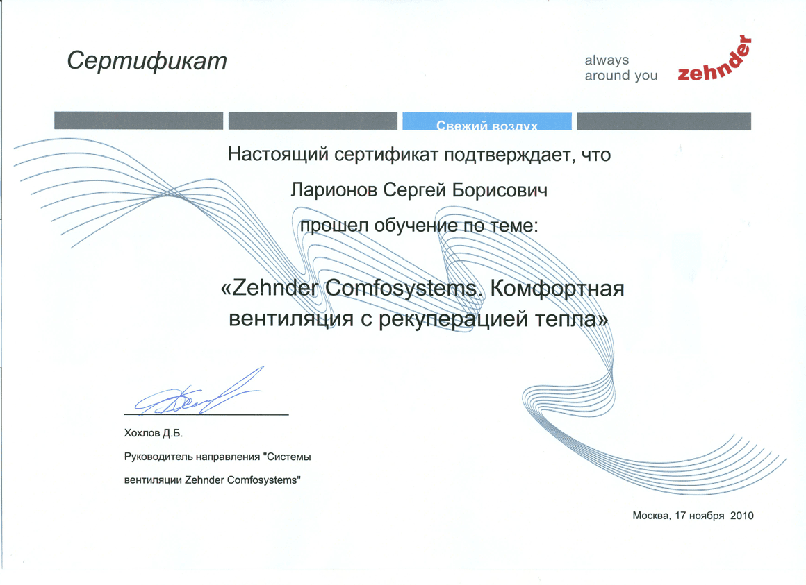 Сертификат обучения по вентиляции Zehnder с рекуперацией тепла