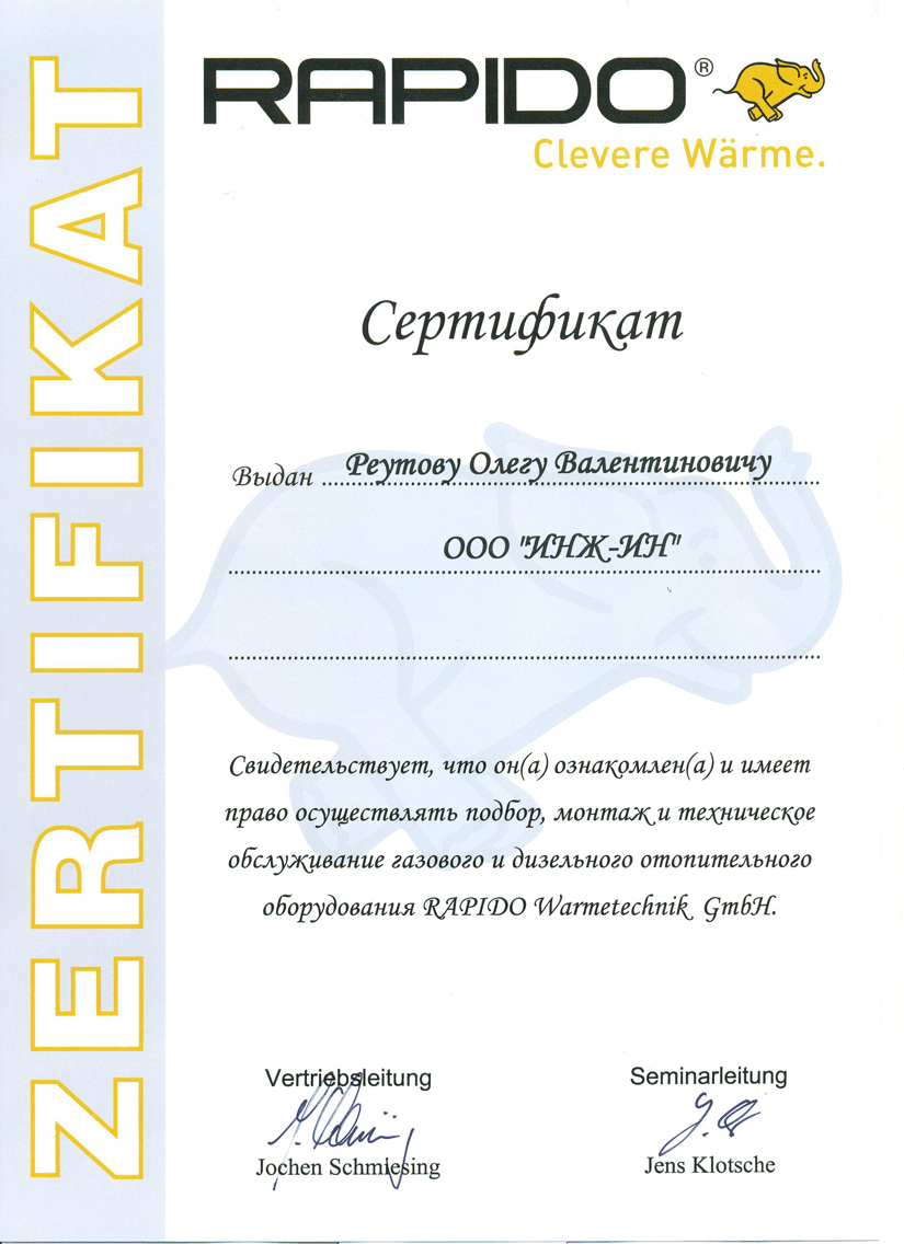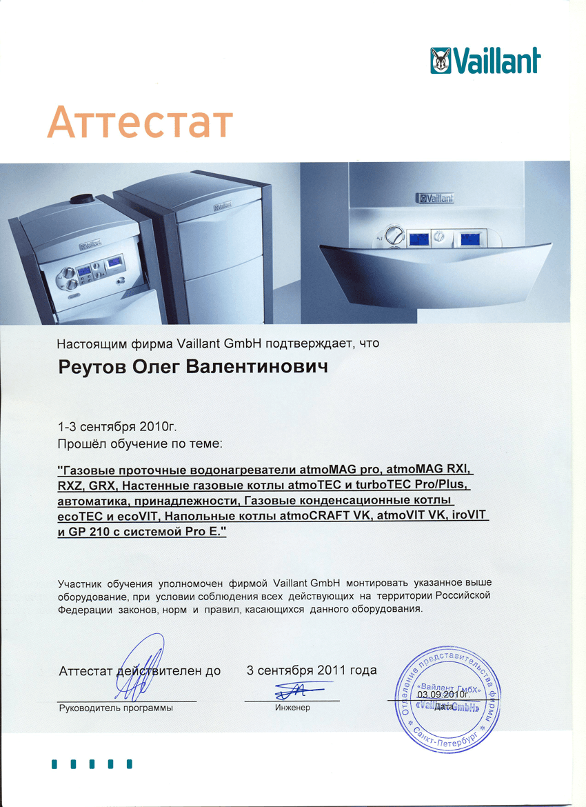 По завершении обучения успешно сдан квалификационный экзамен и получен аттестат, дающий право выполнять монтаж газовых котлов и водонагревателей Vaillant в системах отопления частных домов и коттеджей.