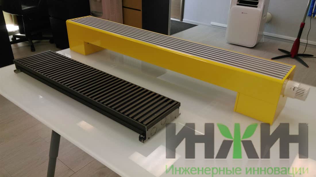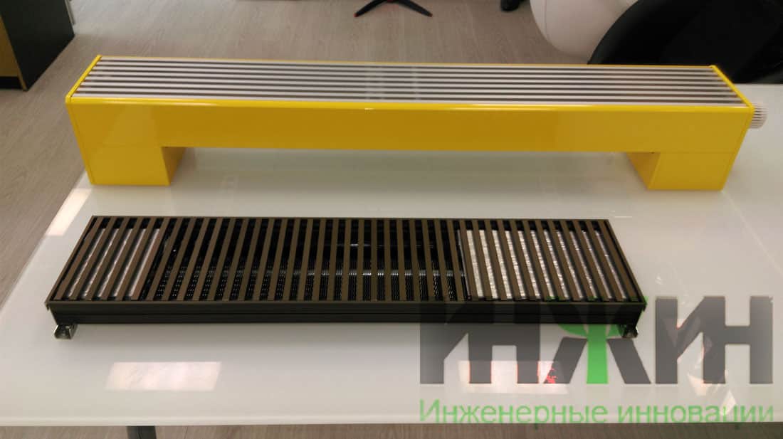 На фото – напольный конвектор, а также конвектор, встроенный в пол, самой минимальной глубины.