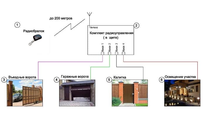 Для реализации системы необходимо на этапе выполнения проекта электрики предусмотреть прокладку кабельных линий от щита к штатным блокам управления воротами и калиткой, а также место в щите да размещения комплекта радиоуправления.