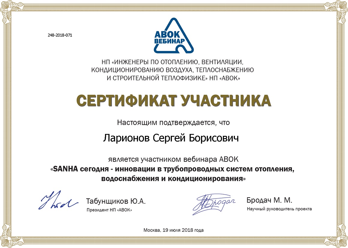 Пройдено обучение на вебинаре АВОК «SANHA сегодня - инновации в трубопроводных систем отопления, водоснабжения и кондиционирования», в рамках которого был изучен: