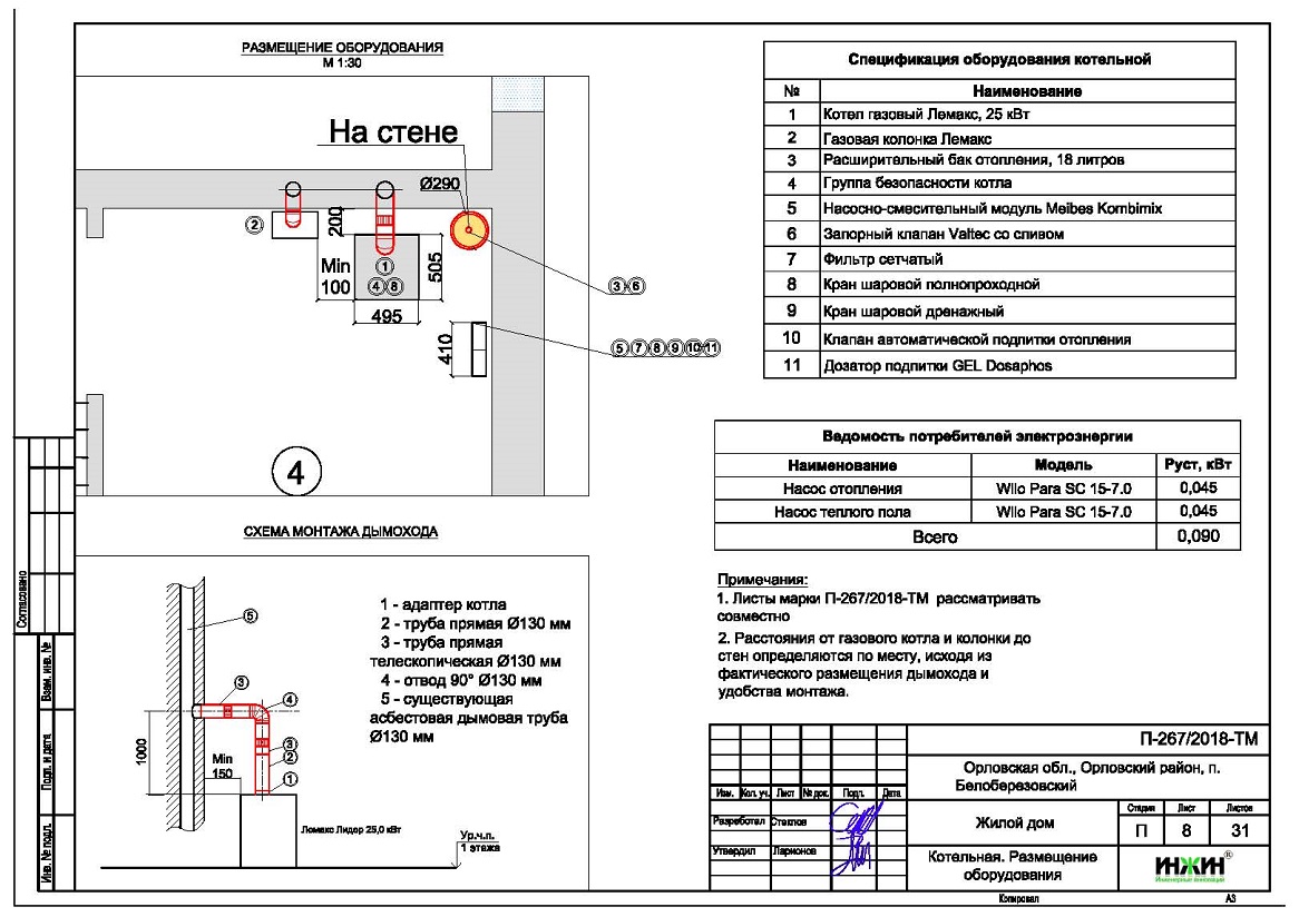 Для загородного дома из пенобетонных блоков, площадью 171 м.кв., расположенного в пос. Белоберезовский Орловской области, разработан проект котельной отопления и теплого пола, в котором, по заданию Заказчика, реализованы следующие основные технические решения: