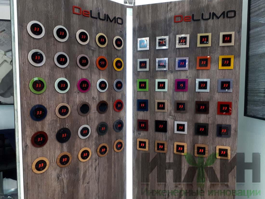 - электронные комнатные термостаты для регулирования отопления DeLUMO, прямоугольной и круглой формы, в рамках из различных материалов, включая дерево;