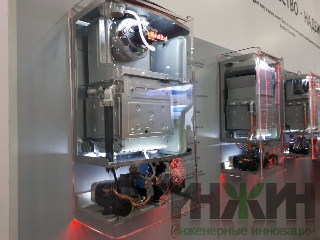 - несколько моделей современных настенных газовых котлов отопления Fondital в прозрачных корпусах, позволяющих оценить качество сборки, представлены модели Minorca CTFS, Antea RBTFS, Antea CTN, Itaca CH KR (конденсационный котел высокой мощности, разработанный специально для модульных котельных до 900 кВт);