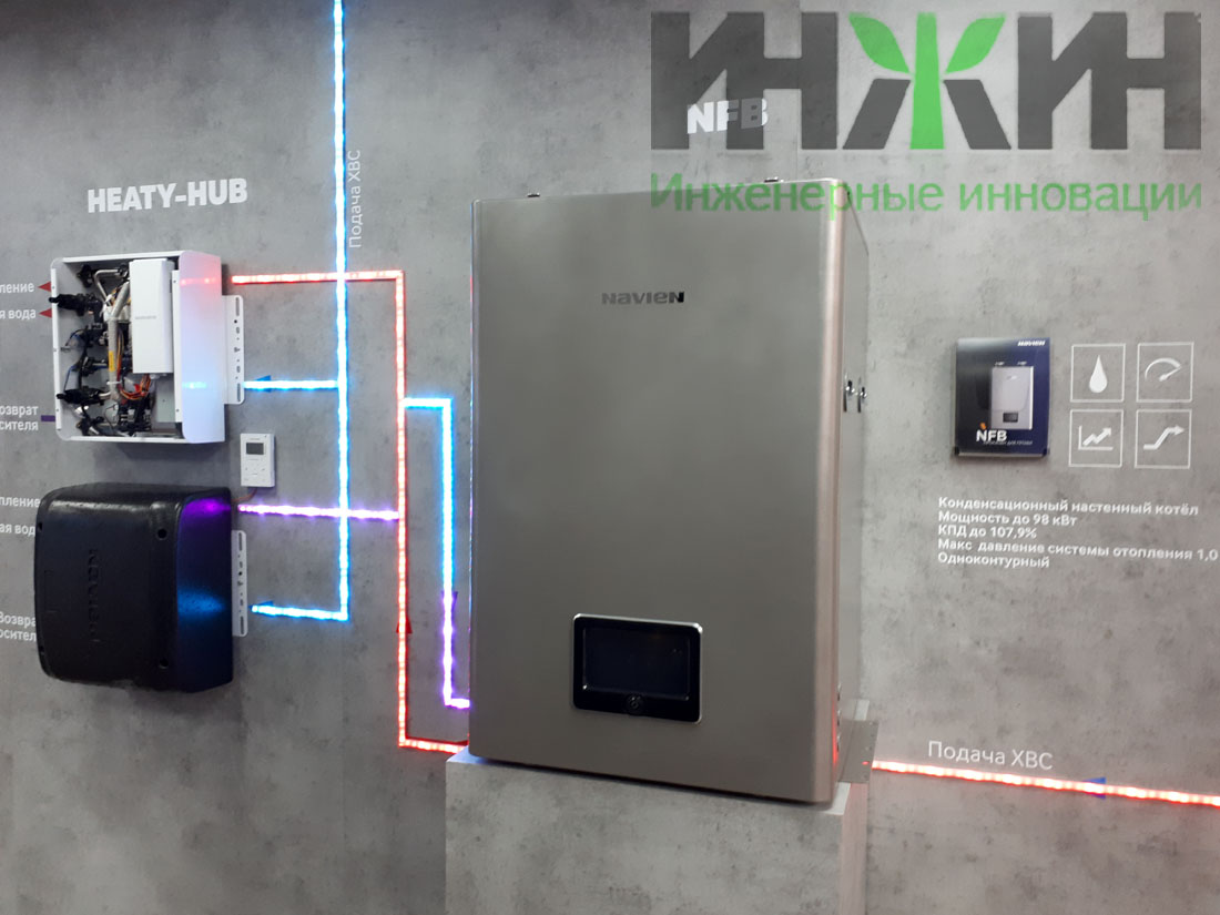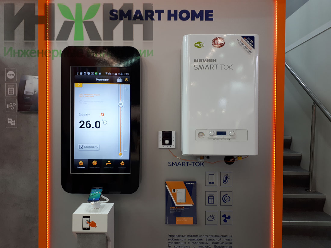 - настенный газовый котел отопления NAVIEN SMART TOK, оборудованный выносным пультом управления с голосовыми подсказками (в комплекте поставки), с возможностью дистанционного управления в мобильном приложении (встроен модуль Wi-Fi) ;