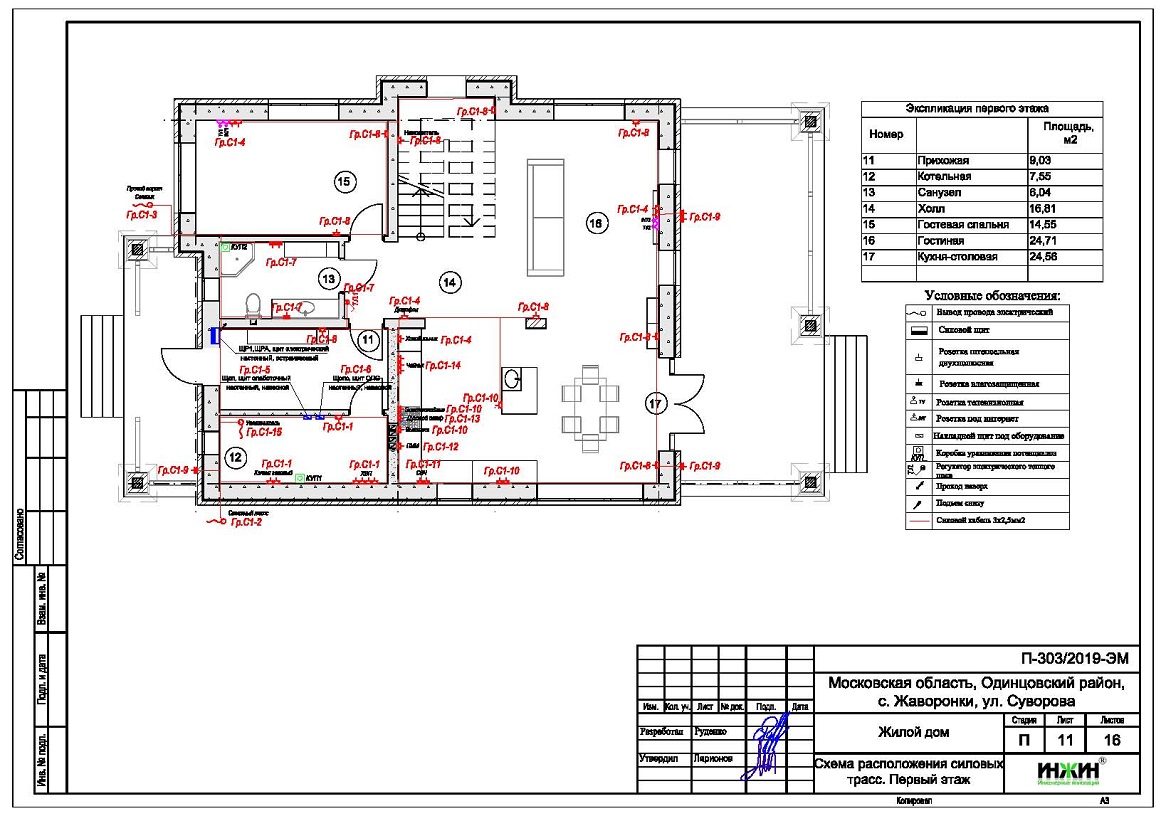 Для загородного дома со стенами из газосиликатных блоков (утеплитель пола - плиты из пенополистирола 100мм, кровли - минвата 250мм), общей площадью 198 м.кв., расположенного в с. Жаворонки Одинцовского района Московской области, разработаны проекты внутренних инженерных систем: электрики, котельной, отопления, водоснабжения и канализации.