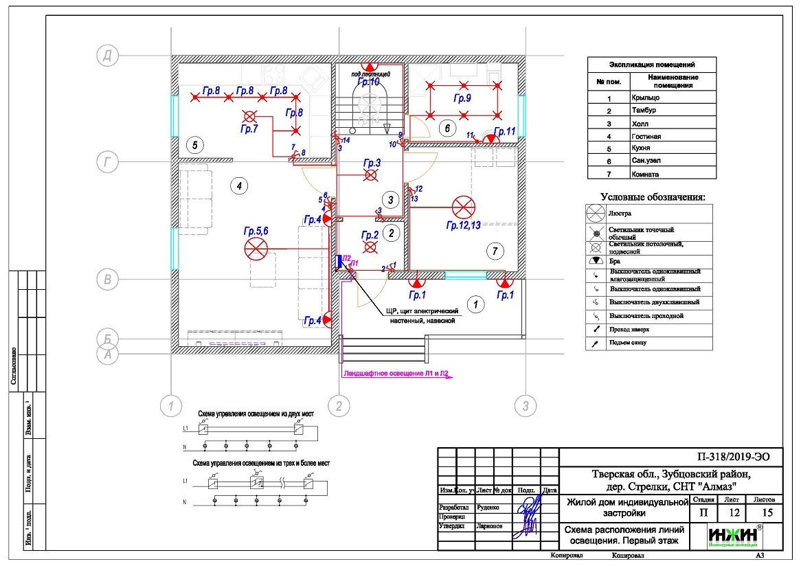 Разработан проект электрики (электропроводки) для каркасного дома площадью 122 кв.м., расположенного в СНТ "Алмаз" Зубцовского района Тверской области.