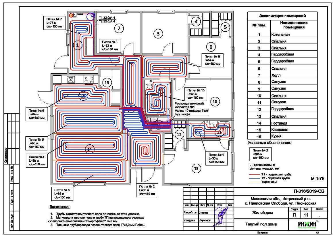 - Отопление дома в с. Павловская Слобода предусмотрено по двухтрубной коллекторно-лучевой схеме с трубопроводами из сшитого полиэтилена Rehau;