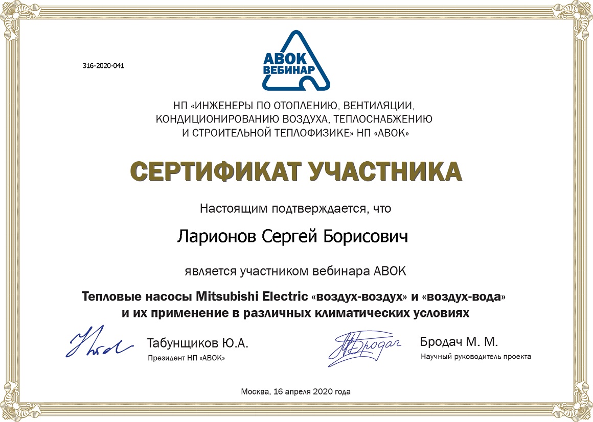 Очередное повышение квалификации и кругозора - пройдено дистанционное обучение на вебинаре АВОК по оборудованию для систем отопления и горячего водоснабжения "Тепловые насосы Mitsubishi Electric «воздух-воздух» и «воздух-вода» и их применение в различных климатических условиях".
