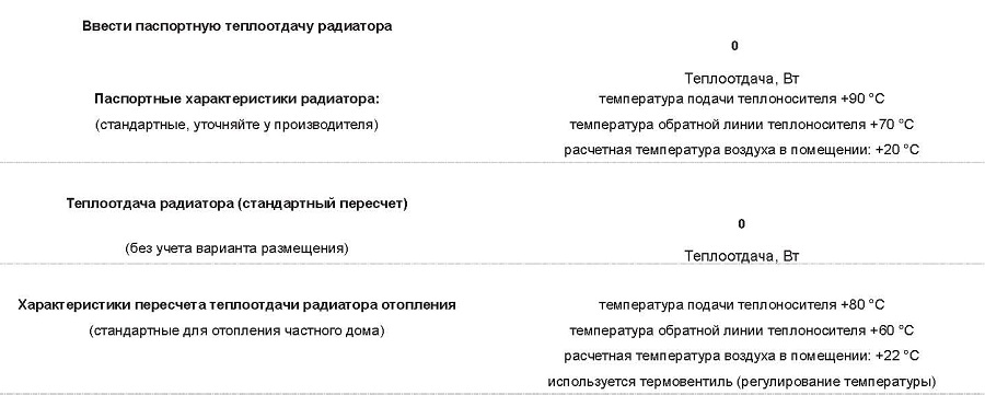 Калькулятор позволит получить данные по реальной теплоотдачи радиатора отопления любого производителя на параметры 80/60/22 при различных вариантах размещения в помещении. Точный расчет теплоотдачи радиаторов производится в проекте отопления, калькулятор облегчит понимания расчетных показателей теплоотдачи приборов отопления, приведенных в теплотехническом расчете.
