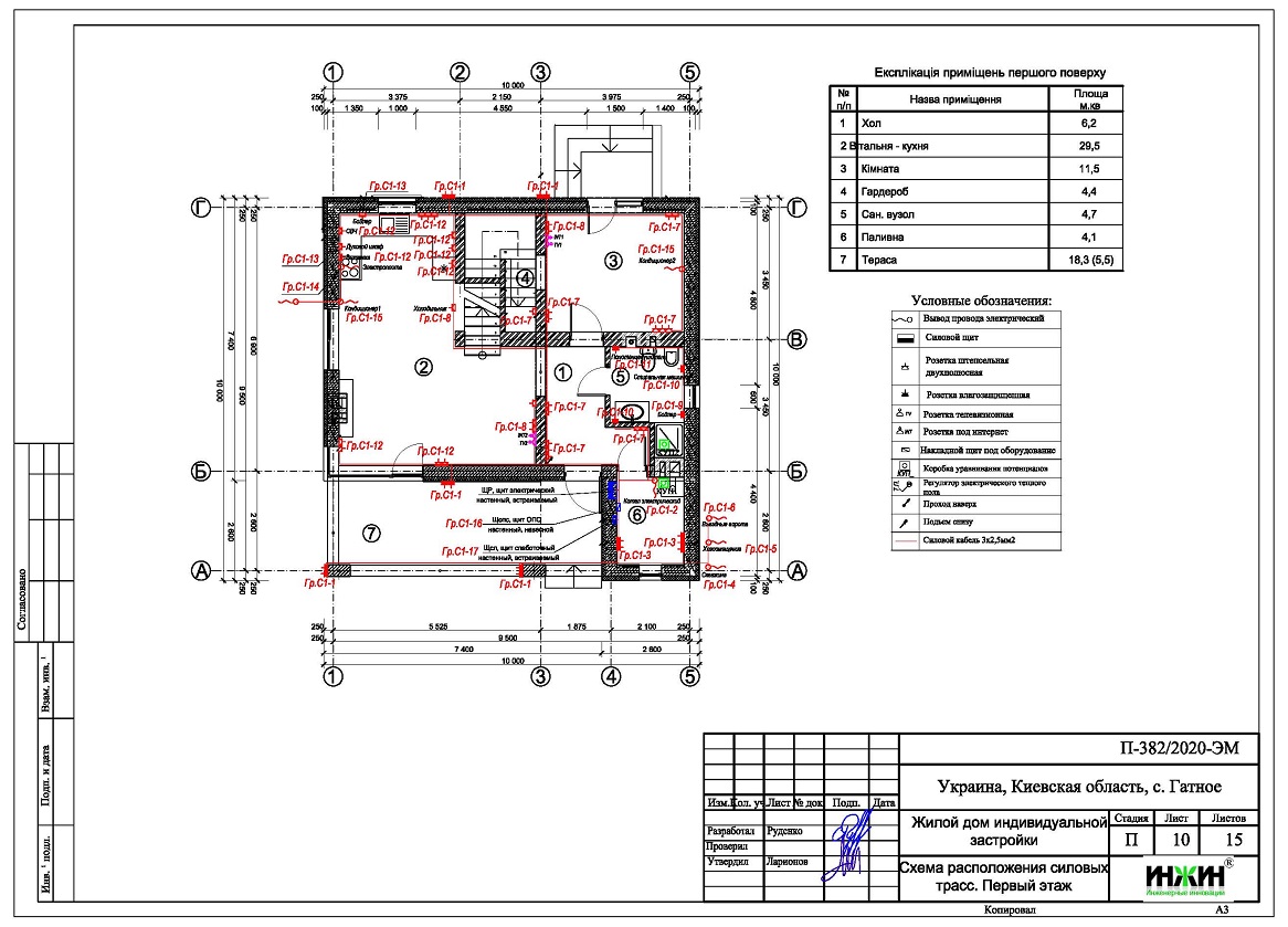 Разработан проект электрики (электропроводки) для газобетонного дома площадью 121 кв.м., расположенного в с. Гатное Киевской области.
