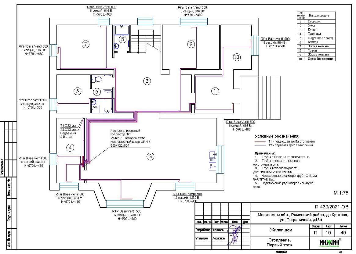 - Водяной теплый пол проектом предусмотрен на площади 130 м.кв., 16 петель;