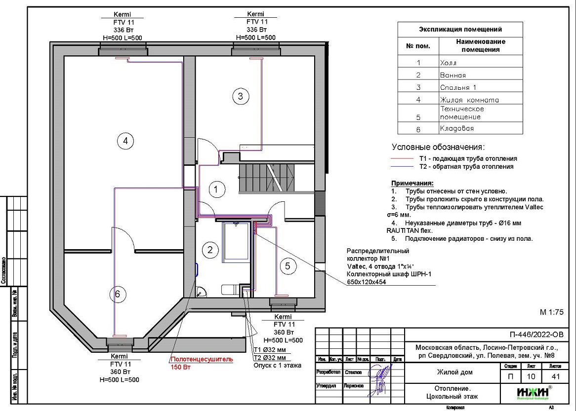 Для загородного дома со стенами из газобетона (утеплитель кровли - ЭППС 100мм), площадью 155 м.кв., расположенного в г. Лосино-Петровский (рп Свердловский), разработаны проекты отопления, канализации и водоснабжения.