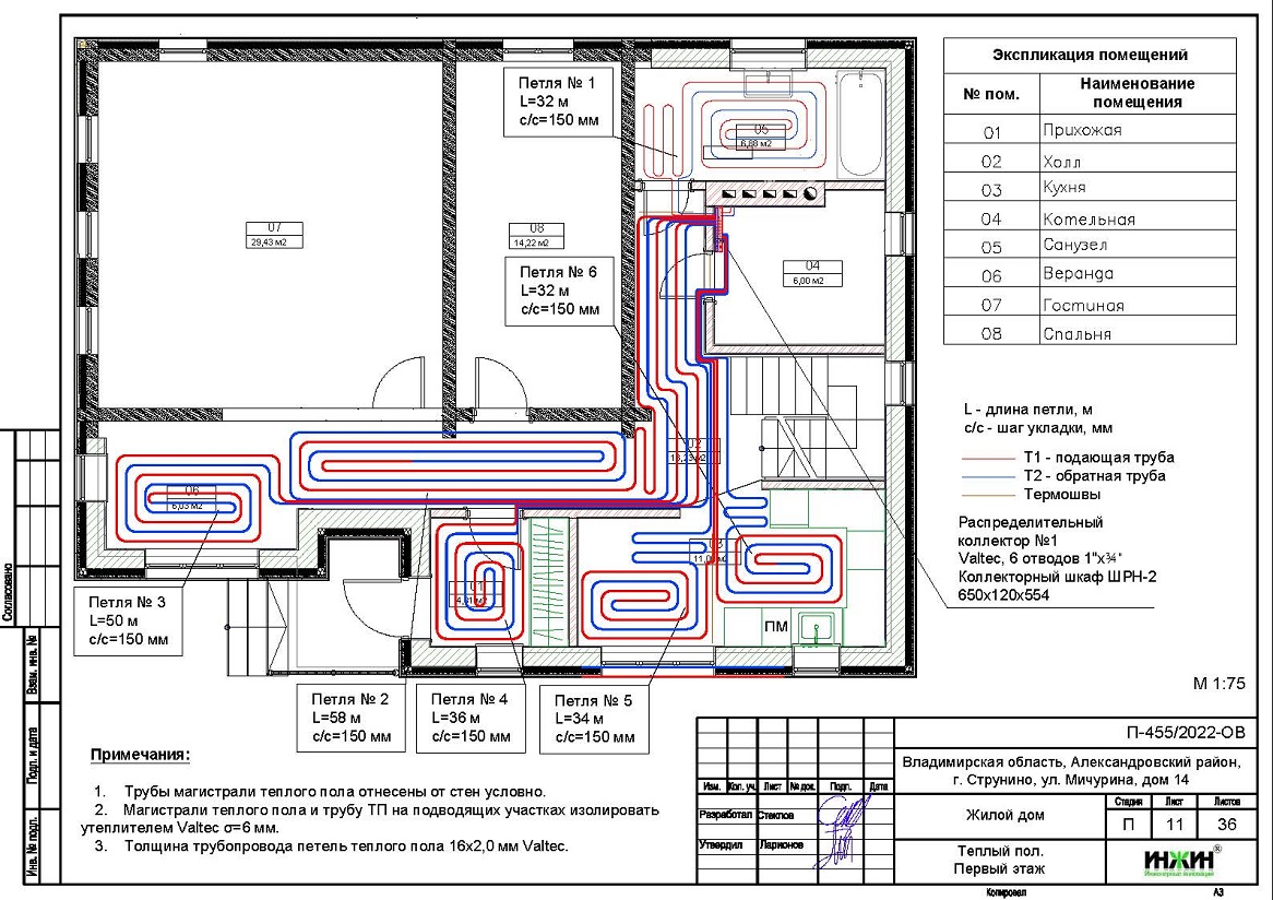 - Водяной теплый пол проектом предусмотрен на площади 46 м.кв., 6 петель;