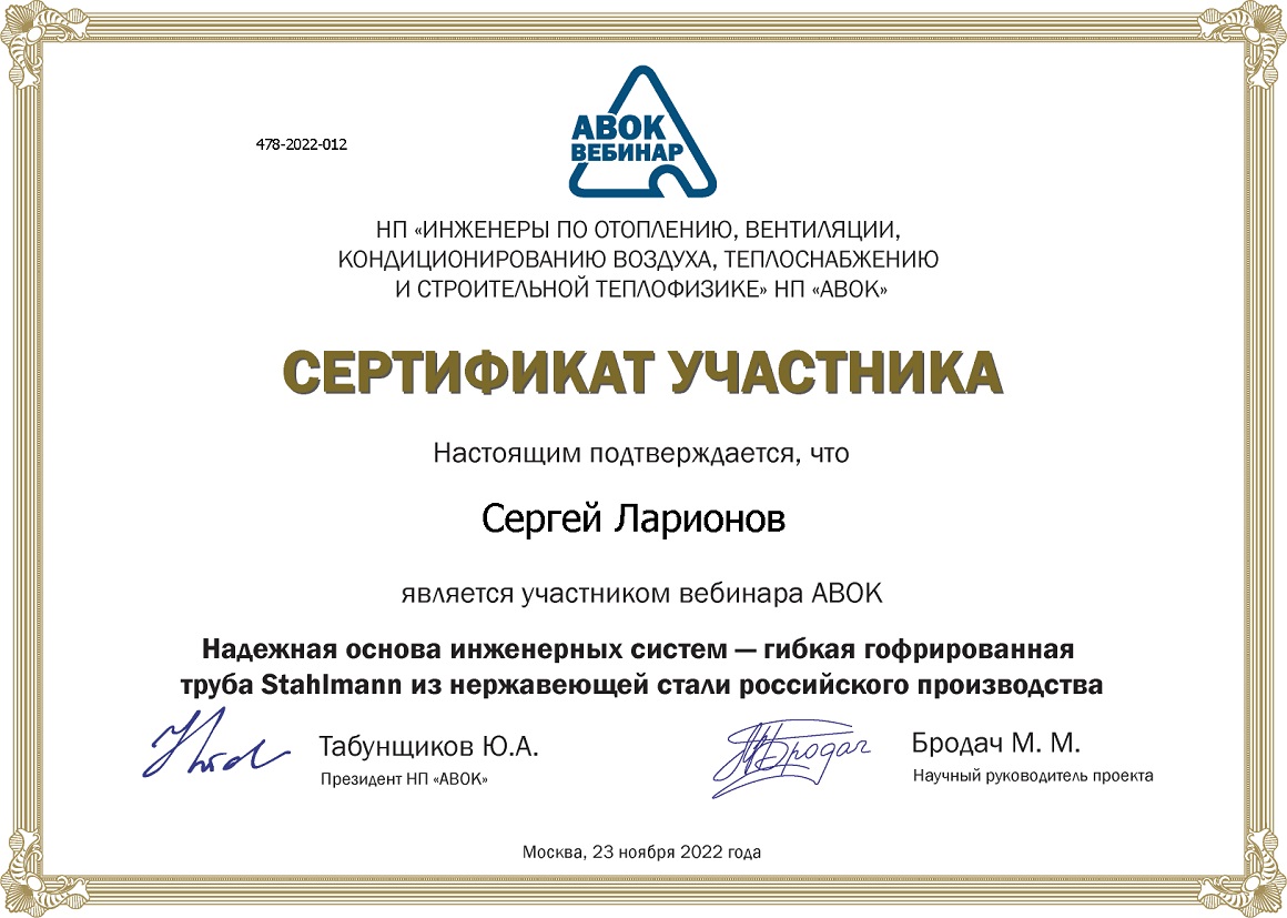 Повышение квалификации - пройдено дистанционное обучение на вебинаре АВОК "Надежная основа инженерных систем гибкая гофрированная труба Stahlmann из нержавеющей стали".