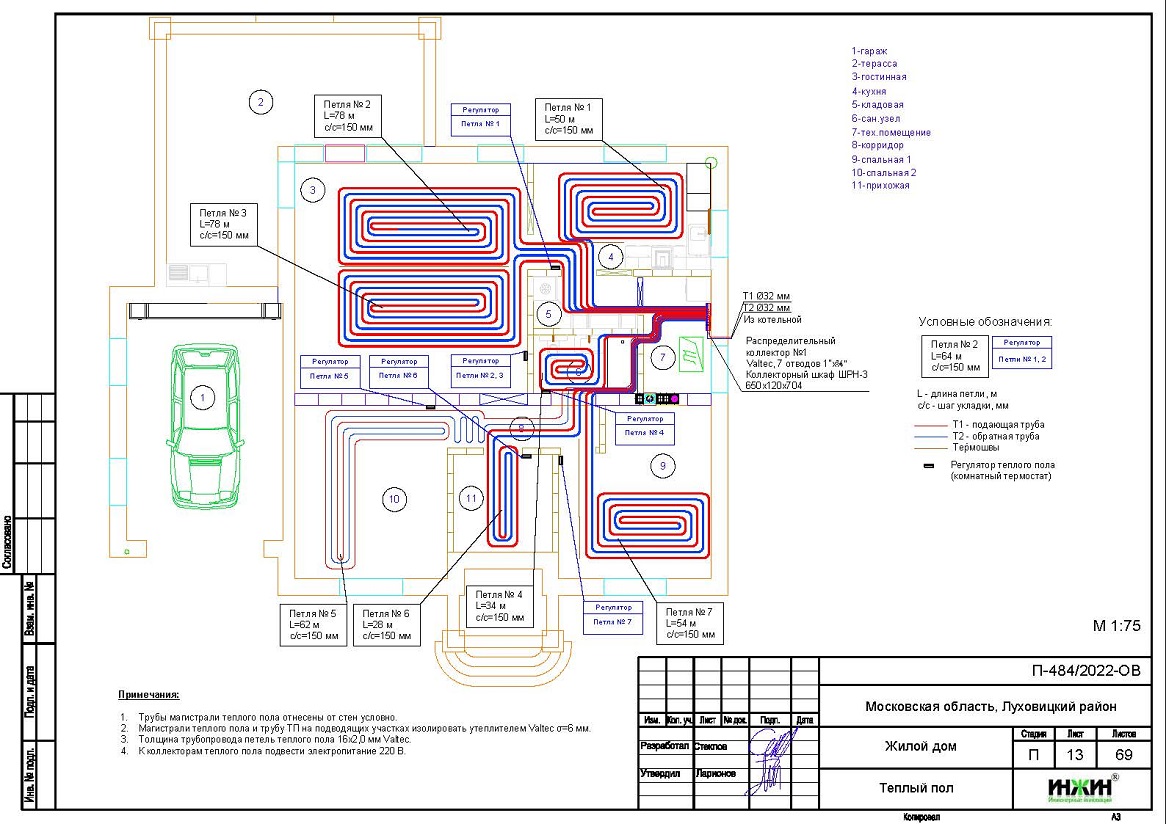- Водяной теплый пол проектом предусмотрен на площади 65 м.кв., 10 петель (7 для дома и 3 для бани);