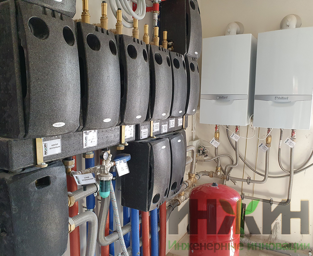 - монтаж восьми контуров теплоснабжения дома с подключением к двум магистральным коллекторам с насосными группами и гидрострелками Meibes;