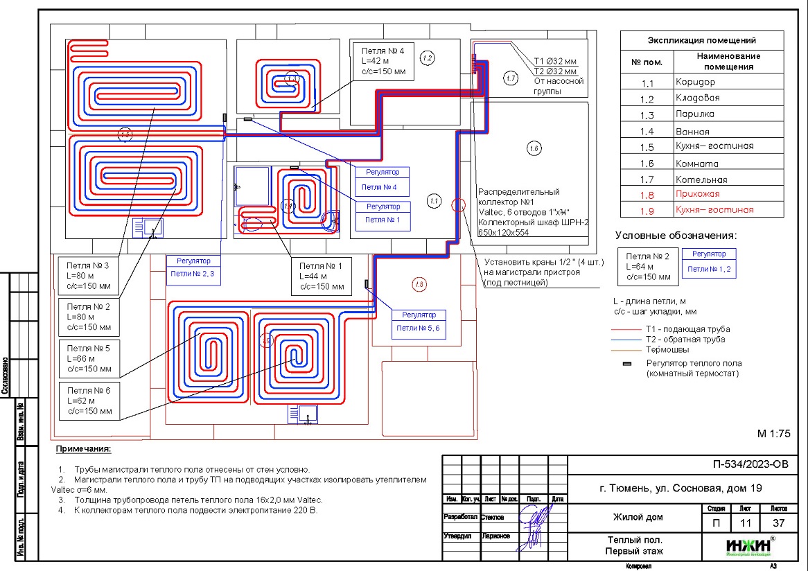 - Водяной теплый пол проектом предусмотрен на площади 75 м.кв., 6 петель;