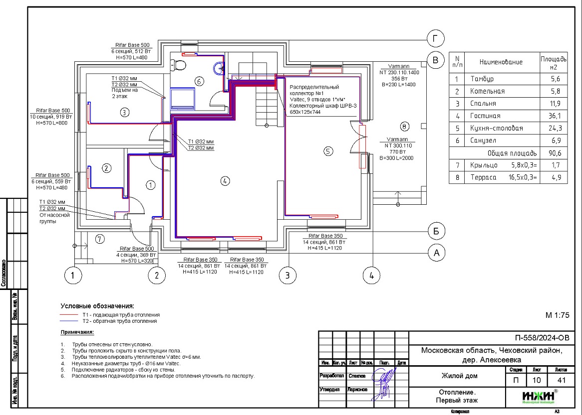 Для загородного дома со стенами из газобетона (утеплитель кровли - минвата 300 мм), площадью 187 м.кв., расположенного в дер. Алексеевка Чеховского района Московской области, выполнены проекты отопления и водоснабжения.