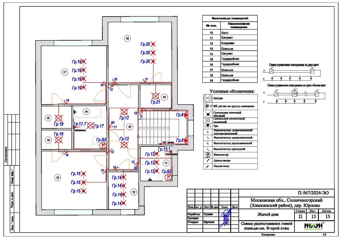 Для загородного дома со стенами из кирпича (утеплитель кровли - минвата 200мм), площадью 157 м.кв., расположенного в дер. Юрлово Солнечногорского района Московской области, разработаны проекты внутренних инженерных систем: электрики, котельной и отопления.