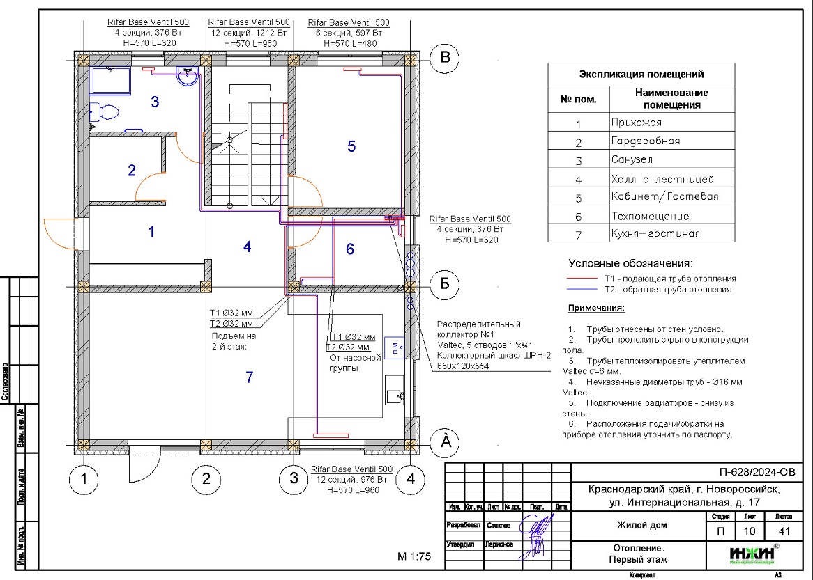 Для загородного дома со стенами из газобетона (утеплитель стен и кровли - минвата 100 и 150мм, соответственном), площадью 173 м.кв., расположенного в г. Новороссийск Краснодарского края, выполнены проекты отопления и водоснабжения.