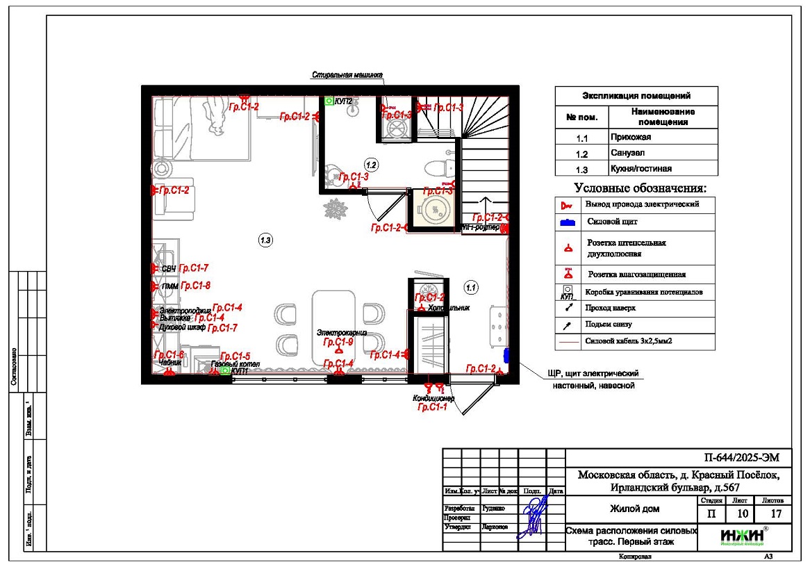 Для таунхауса со стенами из газобетона площадью 120 м.кв., расположенного в КП "Кембридж", г.о. Истра Московской области, разработан проект электрики.