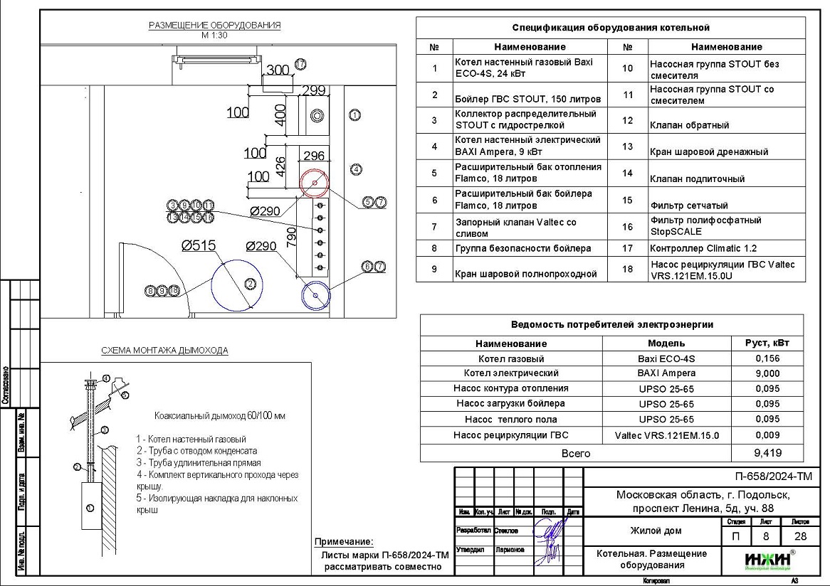 Стоимость проекта отопления дома в г. Подольск - 13 950 руб. со скидкой 10%, проект котельной бесплатно, объем проекта 28 листов.