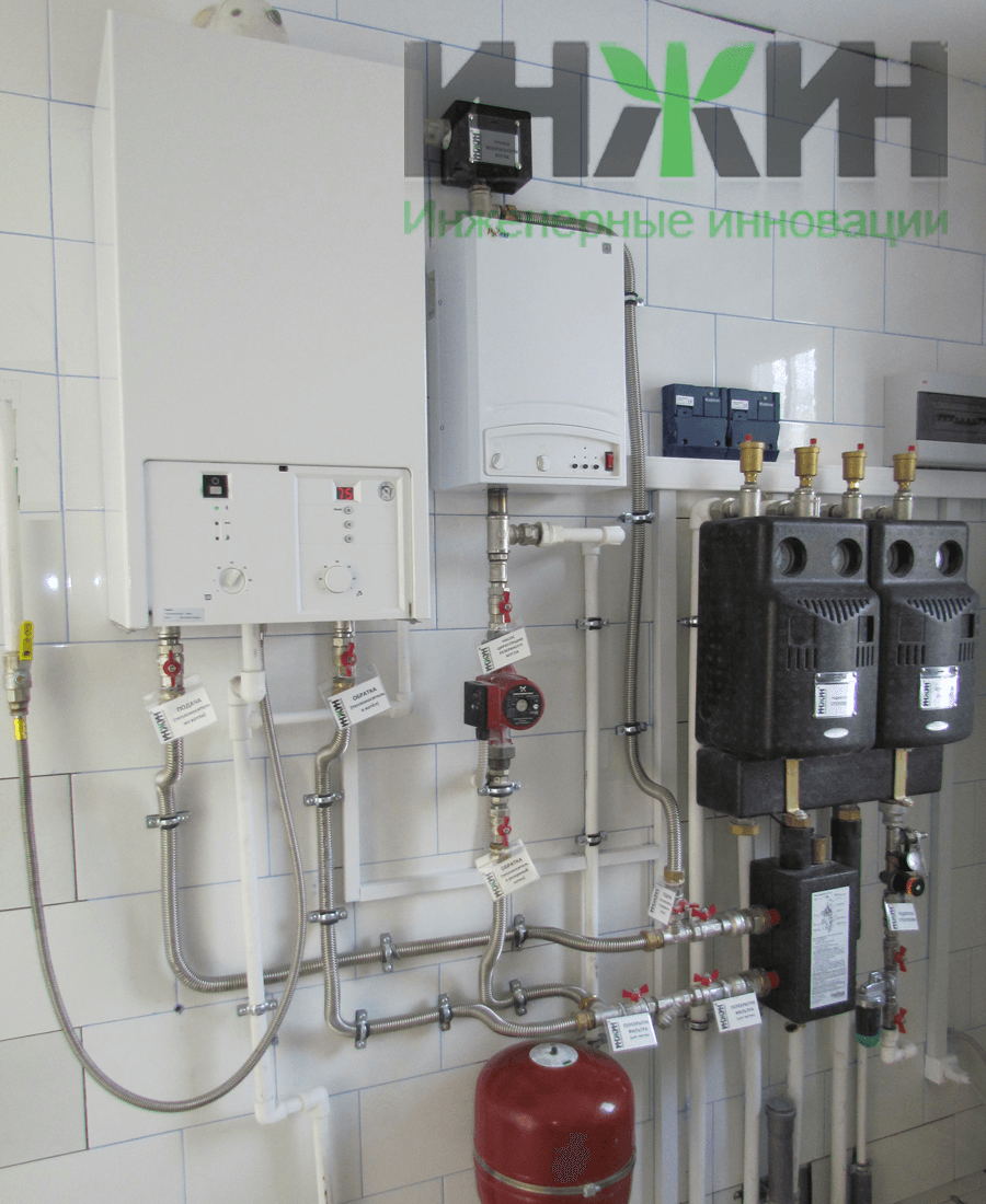 Монтаж основного настенного газового котла Buderus с резервным электрическим РусНит в котельной частного дома