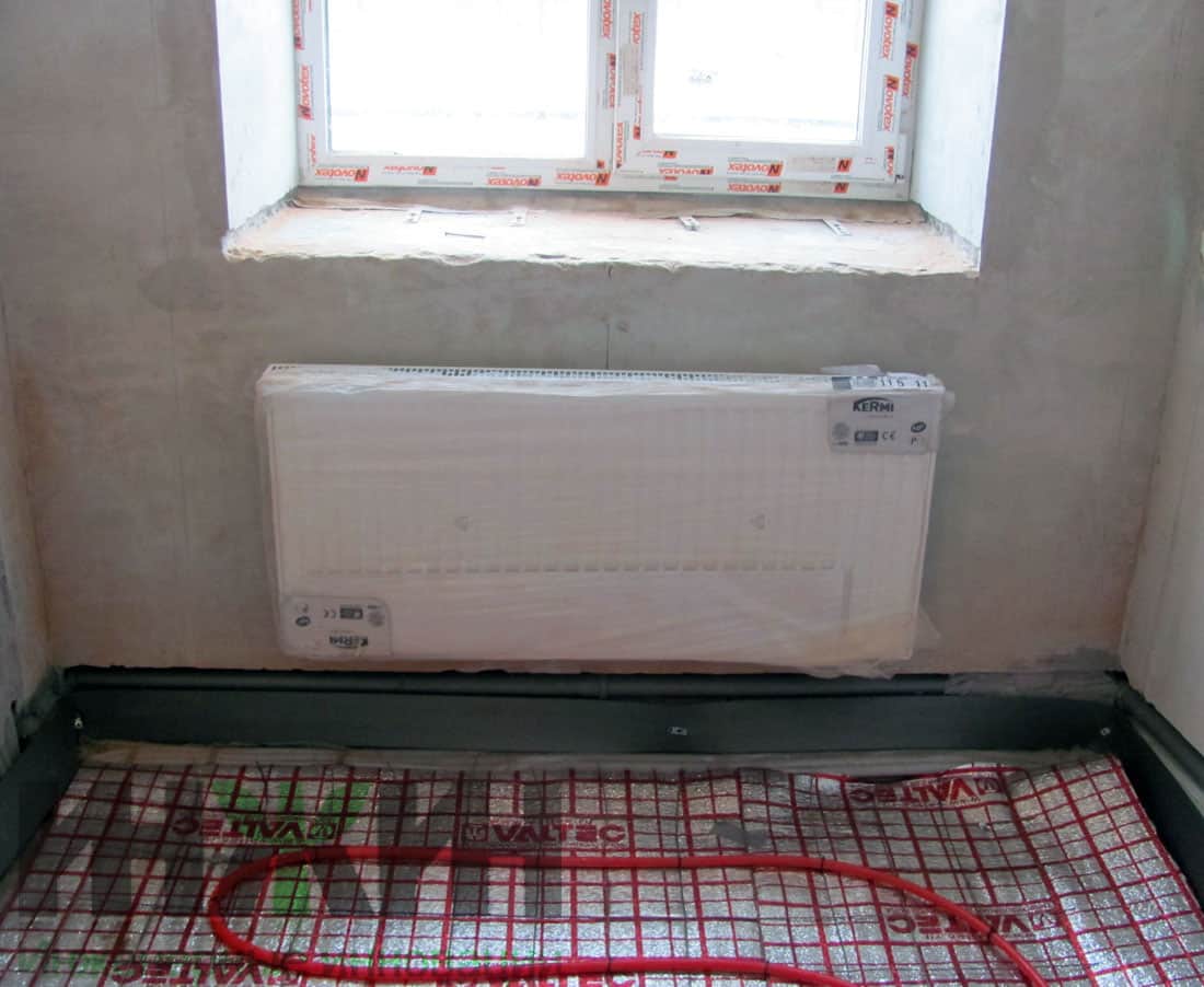 Монтаж радиатора отопления Kermi под окном санузла в таунхаусе