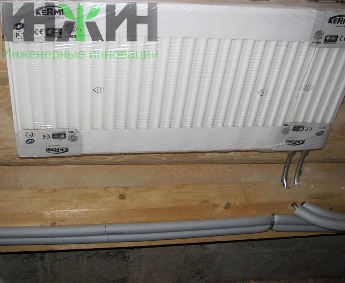 Монтаж радиатора отопления Kermi в деревянном доме, прокладка труб через деревянные лаги