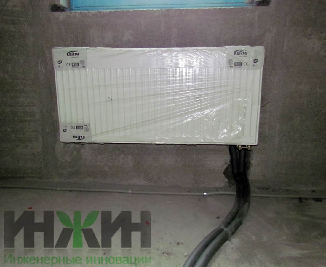 Отопление частного дома, монтаж стального панельного радиатора Kermi на стене