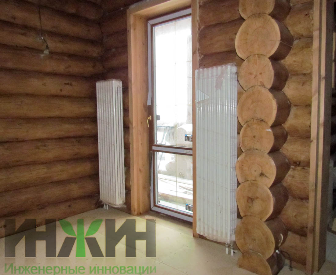 Отопление в деревянном доме, радиаторы Zehnder, монтаж у выхода на балкон