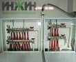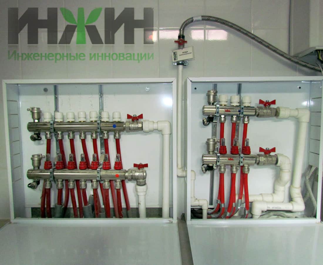 - Монтаж распределительного коллектор с четырьмя насосно-смесительными группами Meibes для контуров отопления, теплоснабжения хаммама, водяного теплого пола и горячего водоснабжения;