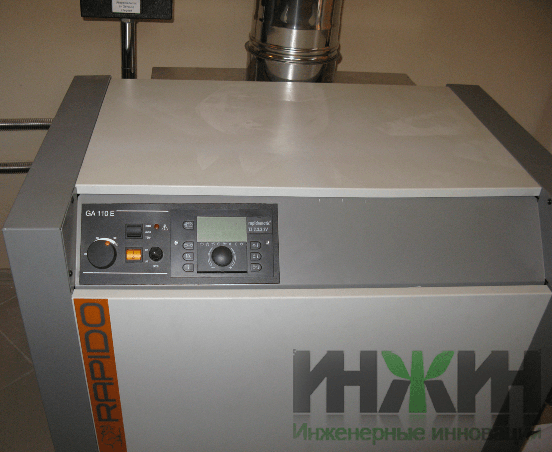 - Монтаж газового котла Rapido (Германия) GA110/46E, с чугунным теплообменником (пластичный чугун), паспортной мощностью 46 кВт и атмосферной газовой горелкой;