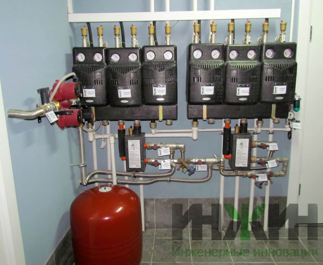 - Монтаж распределительного коллектора Meibes с насосно-смесительными группами и гидравлическими стрелками;