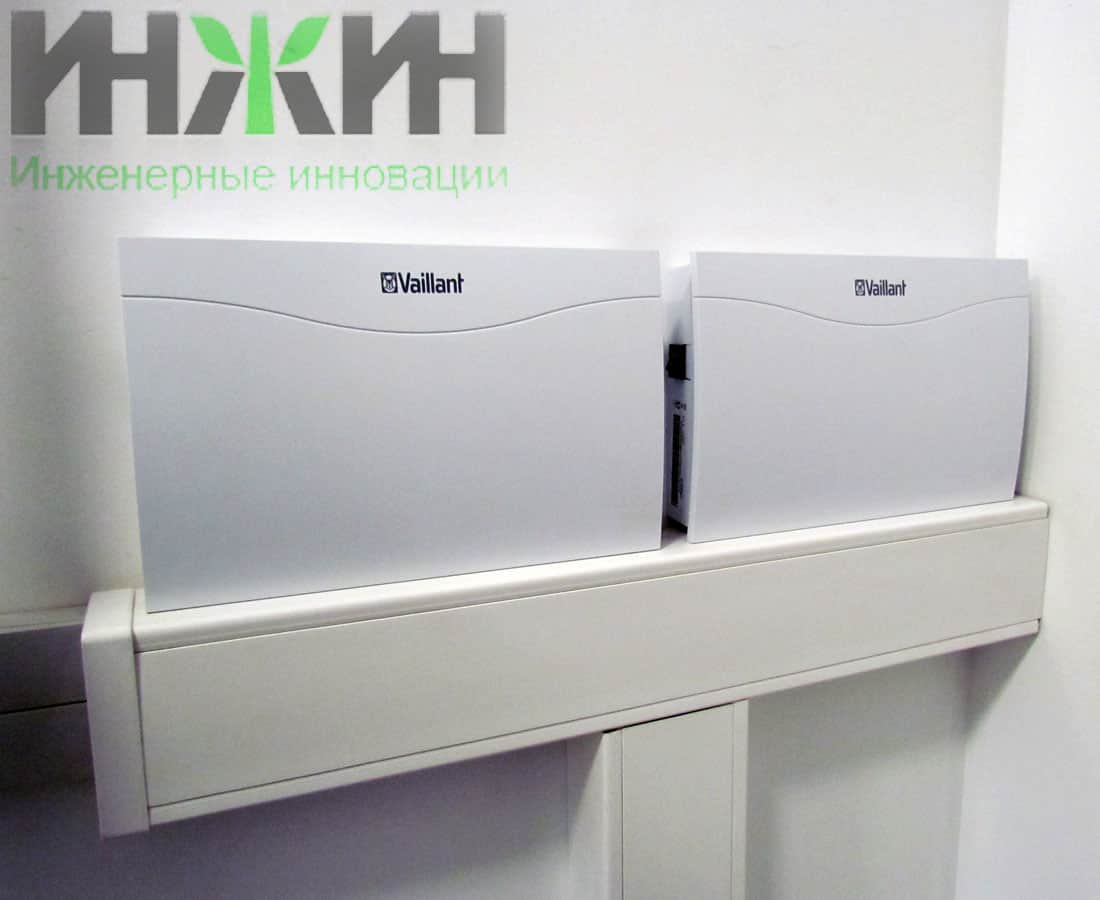 - Автоматики котельной – основного блока Vaillant calorMATIC 630/3, дополнительных блоков для управления контурами со смесителем Vaillant VR60 (2 шт.), задатчиков-регуляторов температуры в помещении Vaillant VR90/3 (2 шт.), с комнатными датчиками.