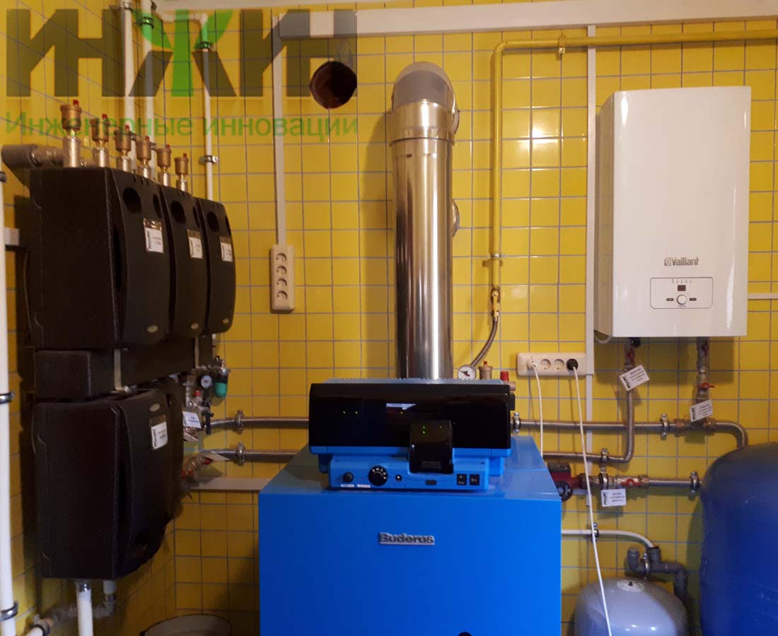- Монтаж двух котлов - основного напольного газового Buderus G234WS, мощностью 44 кВт и резервного настенного электрического Vaillant eloBLOCK, мощностью 12 кВт;