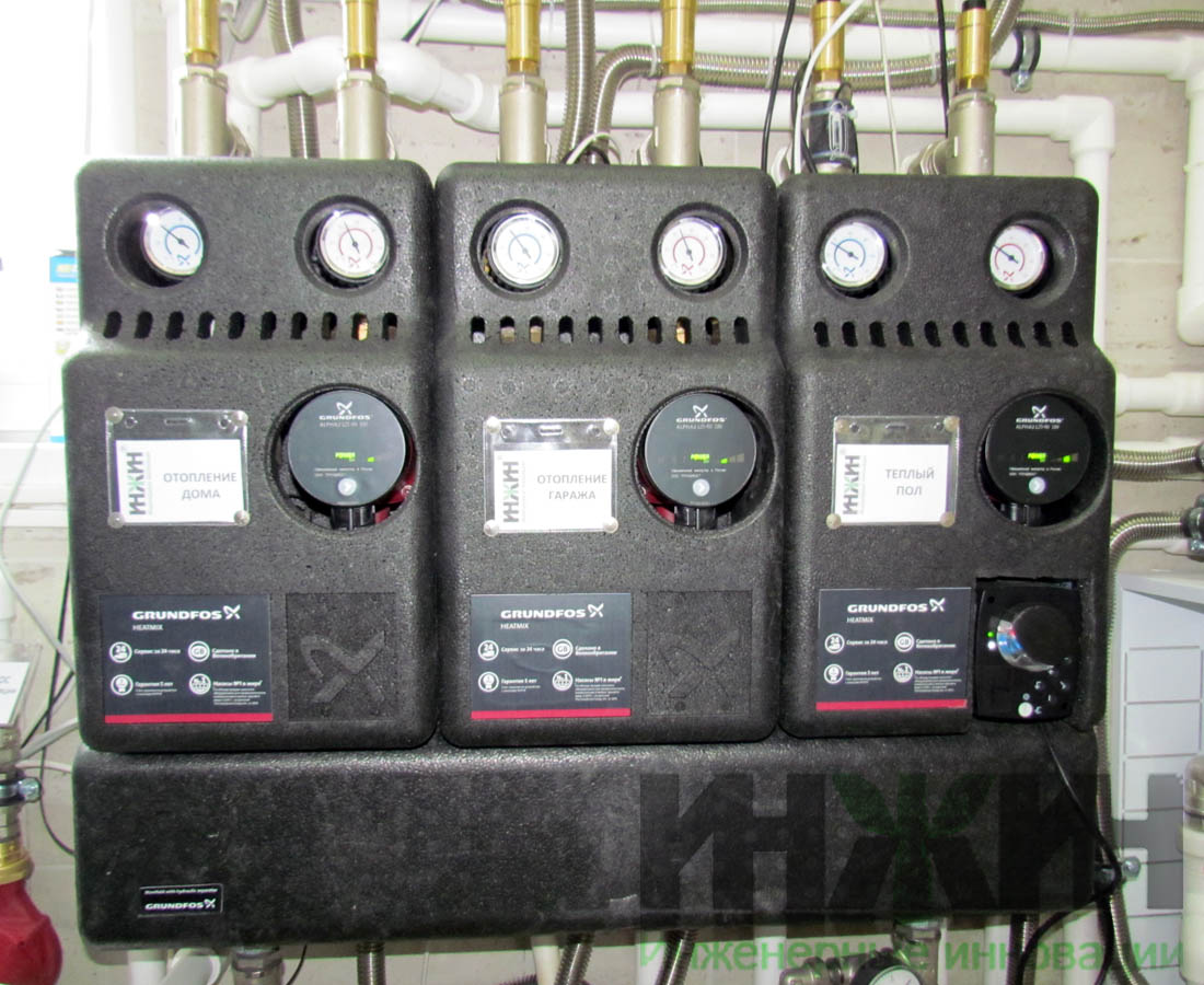 - Монтаж распределительного коллектора котельной Grundfos HEATMIX со встроенным гидроразделителем;