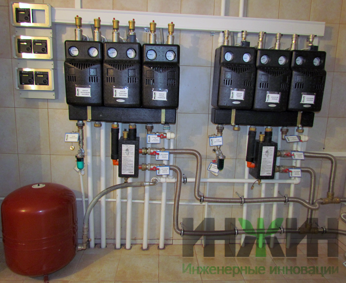 - Смонтировано шесть контуров котельной – отопление бассейна, теплоснабжение вентиляции и теплообменника бассейна, теплоснабжение строений гаража и барбекю, теплый пол, бойлер ГВС;