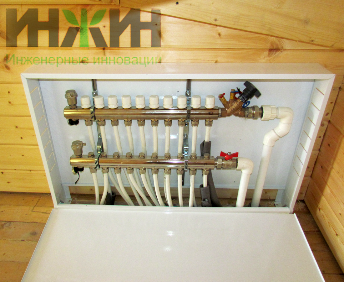 - Схема радиаторного отопления коллекторная, с принудительной циркуляцией теплоносителя. Выполнен монтаж двух коллекторов отопления Valtec на 6 и 10 отводов с наружными коллекторными шкафами Grota;
