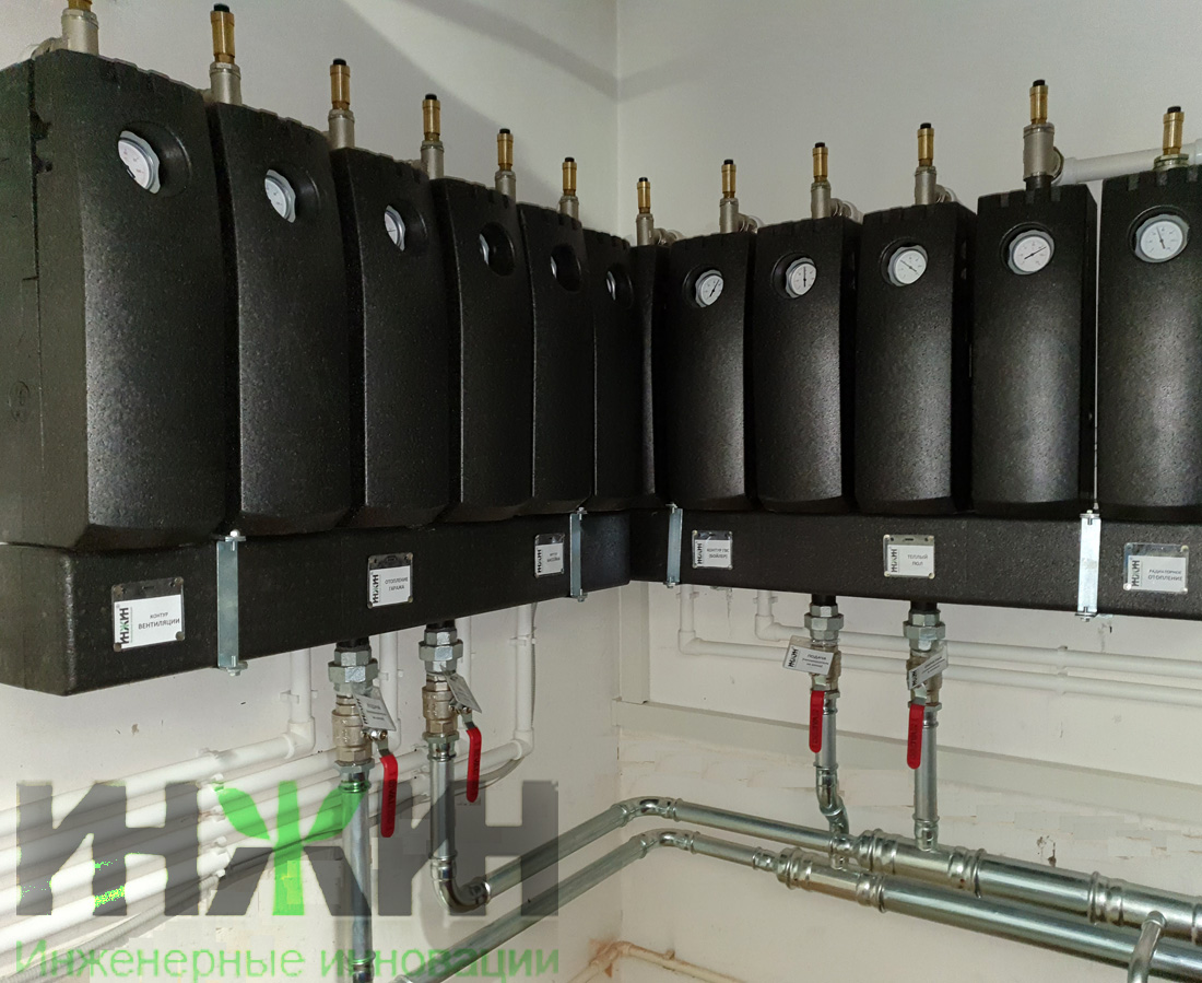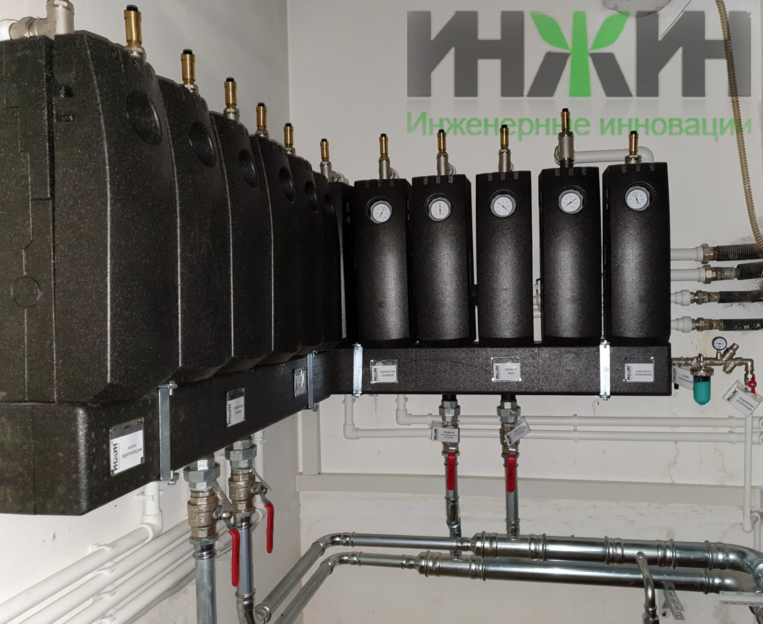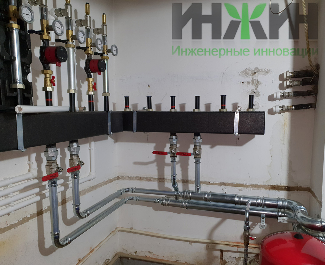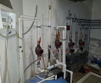 - Установка двух распределительных коллекторов Meibes средней мощности (до 135 кВт каждый) с насосными группами для 6-ти контуров теплоснабжения: отопления дома, теплого пола дома, отопления гаража, теплообменника бассейна, вентиляции бассейна и бойлера ГВС (300 литров). Выполнено подключение насосных групп к существующим магистралям;
